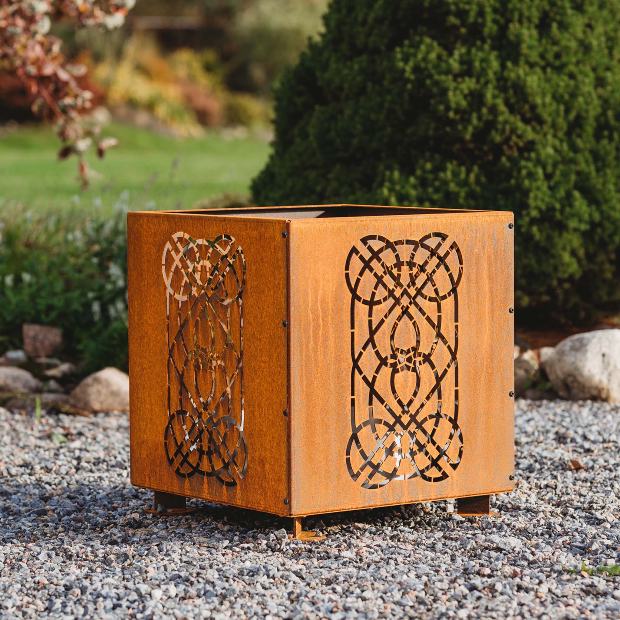 Nøgleordene for vores Laterna bålfad er kompakthed og skønhed. Enkle klare linjer kombineret med slidstærkt udendørsmateriale. Fremstillet af cortenstål, en type kulstofstål, der er bearbejdet for at opnå en beskyttende og vejrbestandig overflade. Overfladen er i begyndelsen grålig, men på grund af vejrforholdene bliver den rødbrun (svarende til rustfarven), som med tiden bliver mørkere.