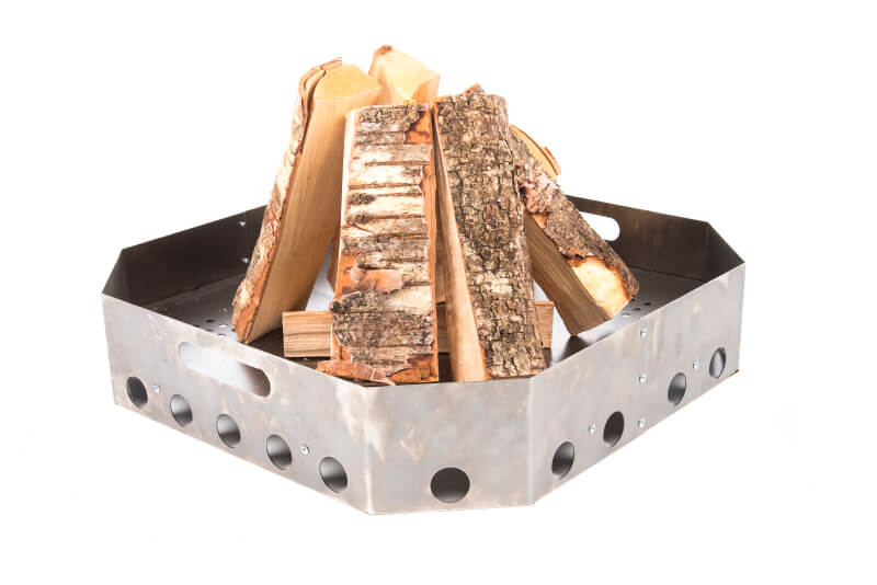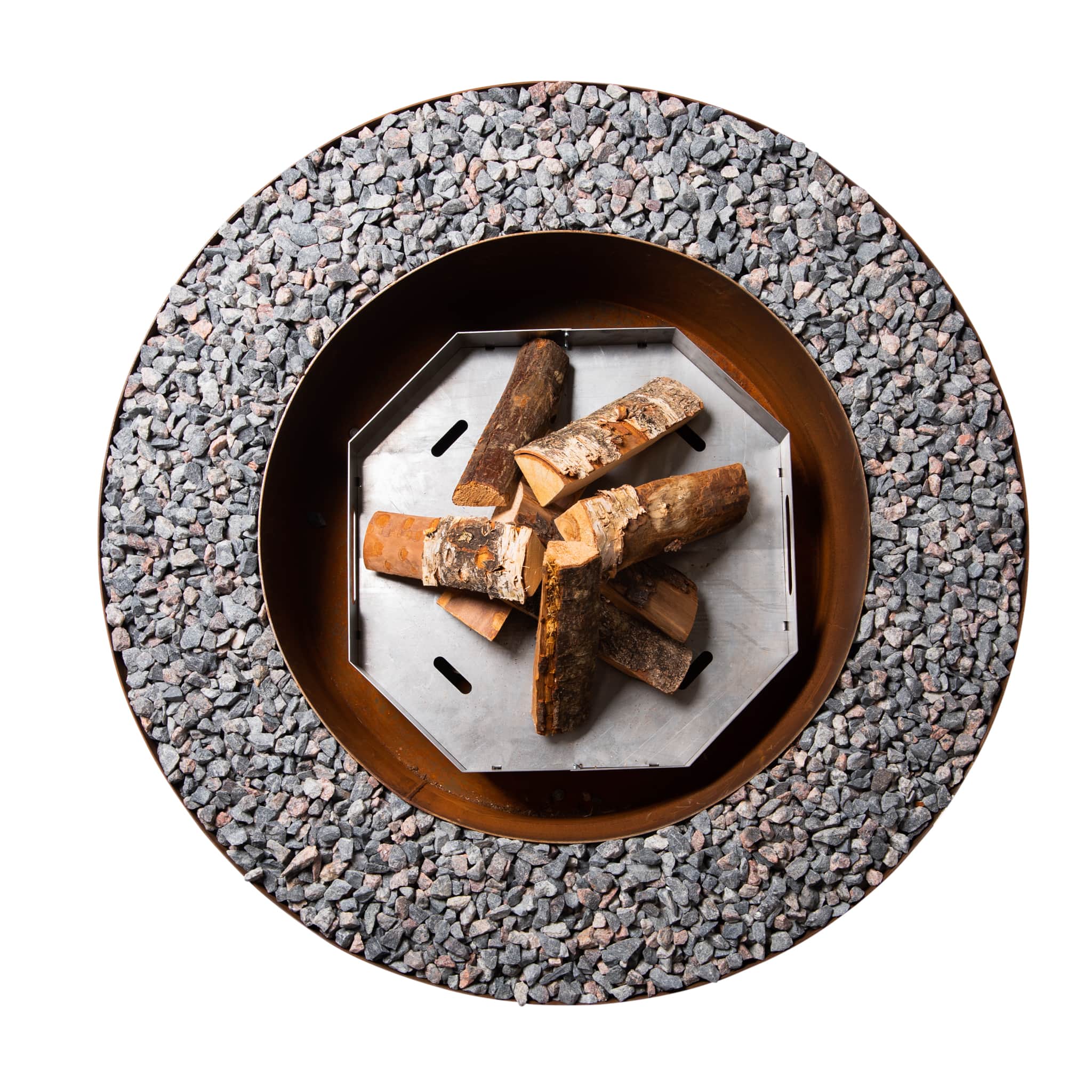 Produktet må ikke placeres på træoverflader, fordi fadet bliver varm under, når du laver bål. Der er huller i bunden af bålfadet, hvorfra der kan falde små stykker kul ud. Hullerne i bunden fungerer som dræn, der forhindrer stående vand i at samle sig inde i pejsen.