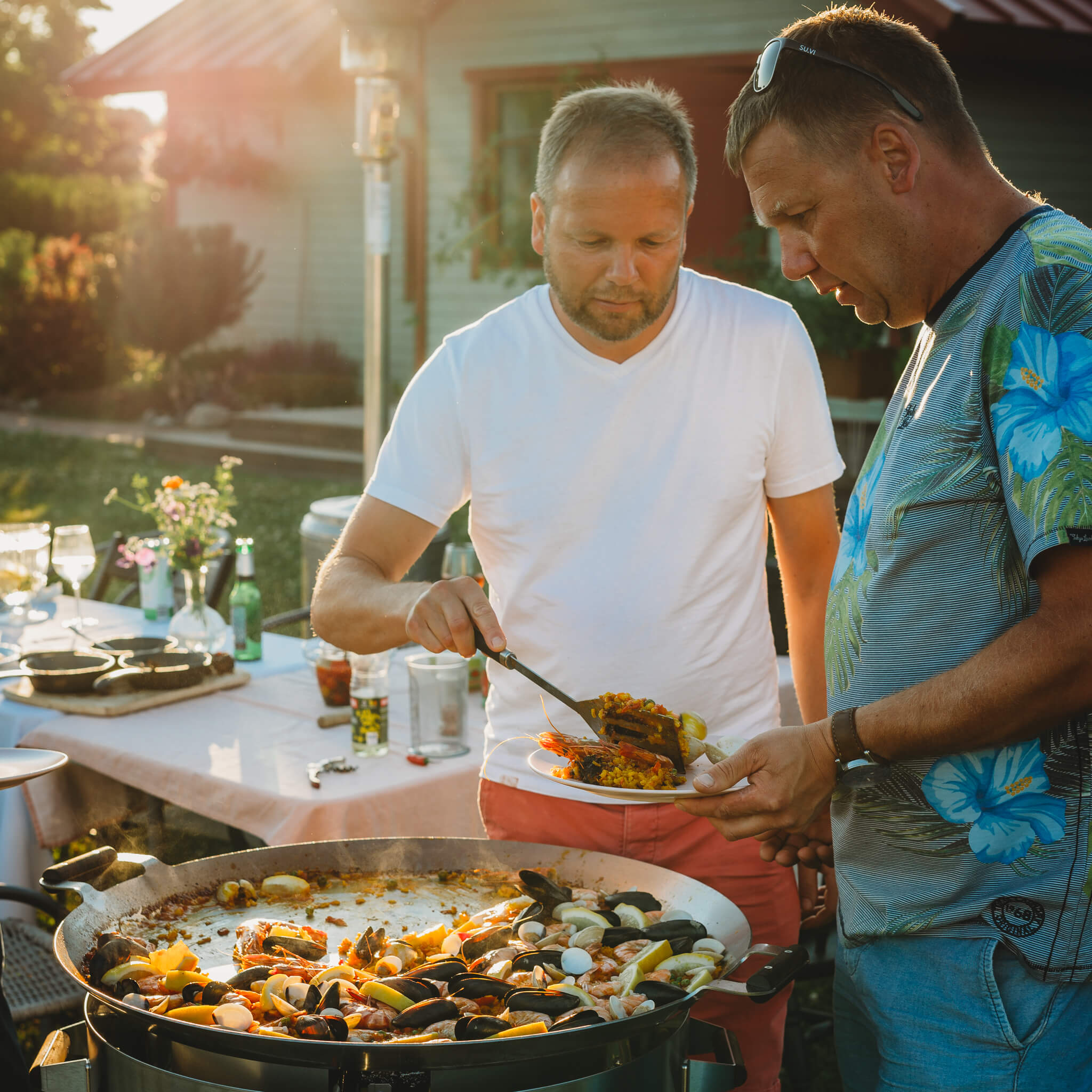Et stegepladesæt udelukkende lavet af rustfrit stål, udstyret med høj kant og gode stegeegenskaber er et glimrende værktøj til at tilberede kød, fisk, grøntsager og forskellige risretter udendørs. Delikate store og tynde pandekager er en populær anvendelse. Vores rustfri stål PRO-720 inox stegeplade er meget populær blandt hjemmekokke, fest- og grillfestarrangører, nem at transportere, sætte op og afmontere. På en stor rustfri stegepande kan du lave f.eks. gryderetter, fordi det aldrig bidrager til misfarvning af \”lette\” retter, som kan ske med en normal stålpande, når det indbrændte lag bliver vådt. Det blanke og effektive udseende giver også ekstra point, når det serveres direkte fra panden! Stegepanden bruges i dag af hundredvis af iværksættere i Skandinavien, Finland, Storbritannien og de baltiske lande. En robust konstruktion og en kraftig brænder under den tykbundede pande, der med sin kanthøjde på 40 mm og elektrisk tænding er klart højtydende. Det muliggør hurtig tilberedning og servering af mad til mange gæster, der spiser på samme tid. Den tredobbelte vindbeskyttelse omkring brænderen er unik og giver optimal beskyttelse mod vind- og varmetab samtidig med, at gasforbruget holdes nede. PRO-720 inox er et stykke udstyr, der muliggør tilberedning af retter af såvel friske råvarer som halvfabrikata. Panden er dimensioneret til 20 – 30 portioner afhængig af retten og den flade bundprofil gør det nemt at holde varmen, mens den 40 mm høje kant sammen med låget muliggør både stuvning og rygning, kun fantasien sætter grænser.